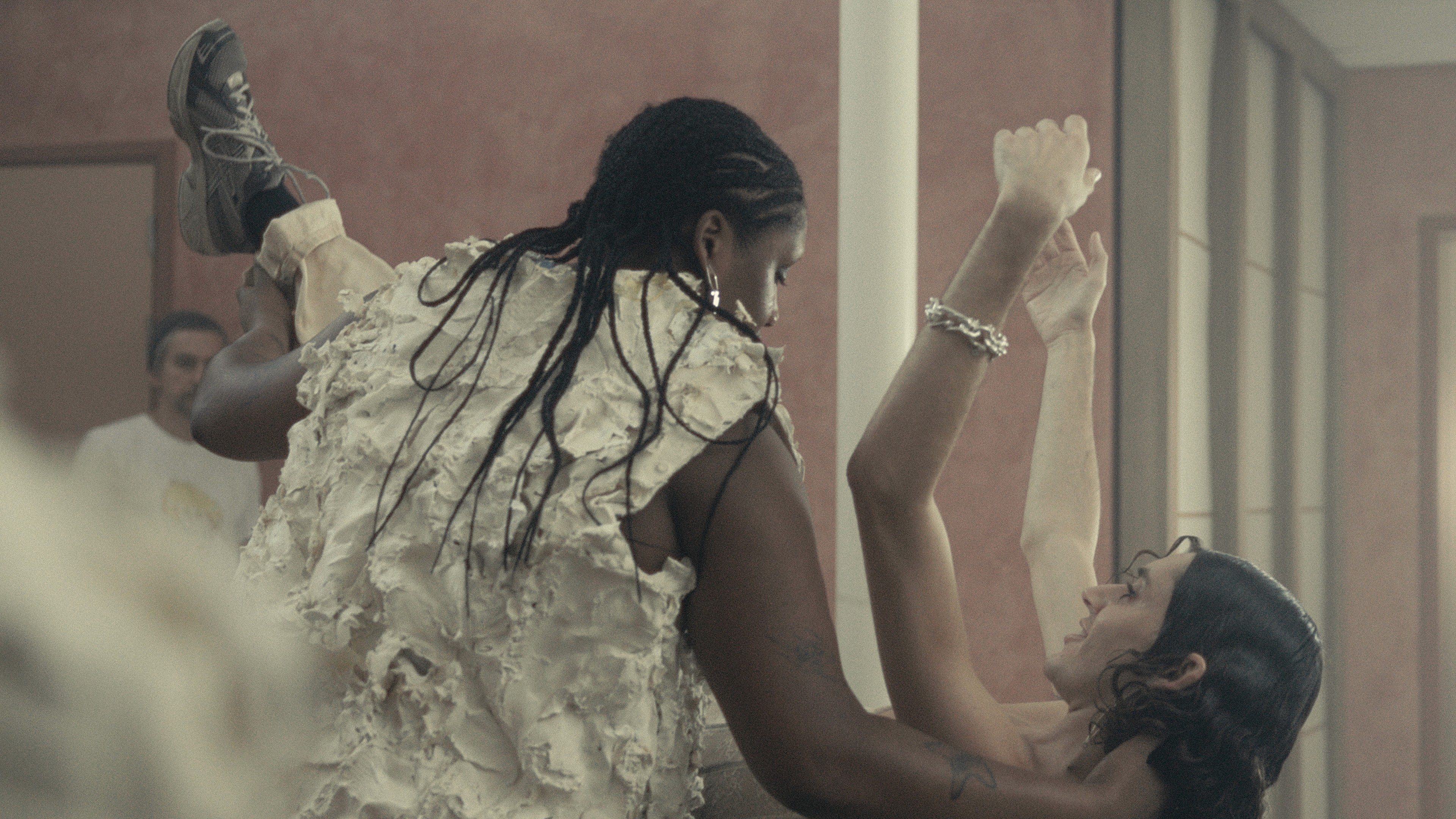 During the film, two performers are presented as sculptures, their bodies manipulated and moved by the artists. But conflict arises when discussions emerge about who is the most original - the artist or his creation?